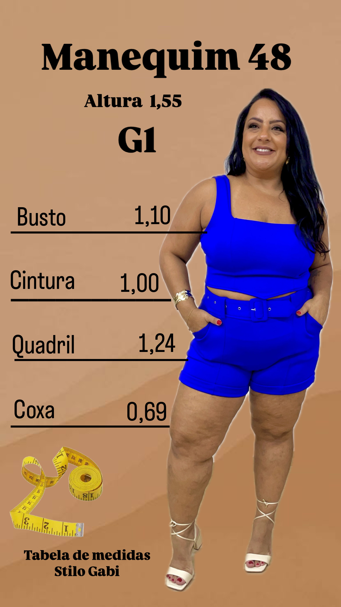 | Tamanho | Busto (cm) | Cintura (cm) | Quadris (cm) | |---------|------------|---------------|---------------| | 46 | 96-98 | 80-82 | 104-106 | | 48 | 100-102 | 84-86 | 108-110 | | 50 | 104-106 | 88-90 | 112-114 | | 52 | 108-110 | 92-94 | 116-118 | | 54 | 112-114 | 96-98 | 120-122 | | 56 | 116-118 | 100-102 | 124-126 | | 58 | 120-122 | 104-106 | 128-130 |